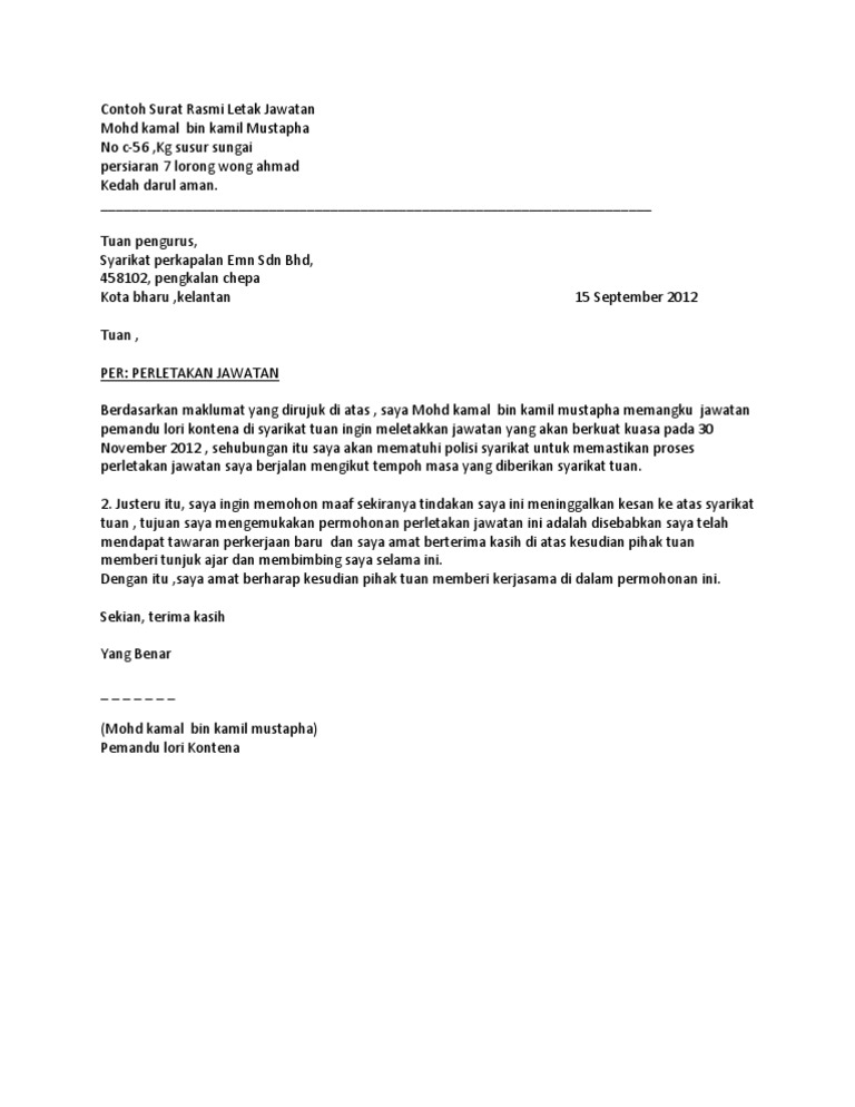 Surat rasmi behenti kerja perlu diserahkan kepada majikan dengan memberi alasan. Surat rasmi, contoh surat resmi, contoh surat perjanjian, contoh surat keterangan kerja, contoh surat permohonan pertukaran via www.scribd.com. Sudah semestinya satu perkara yang anda perlu buat sebelum berhenti kerja adalah menulis surat perletakan jawatan secara rasmi. Justeru itu, surat perletakkan jawatan perlu berserta dengan nama majikan bagi memudahkan urusan yang seterusnya. Surat berhenti kerja adalah surat pemberitahuan kepada hr atau majikan sekiranya mereka ingin meletak jawatan daripada pekerjaan mereka sekarang. Dalam format surat rasmi, kata panggilan yang digunakan hanyalah tuan untuk lelaki dan puan untuk jika anda ingin meletak jawatan dari pekerjaan tapi segan nak beritahu boss anda. Untuk mengetahui lebih lanjut mengenai perletakan jawatan secara rasmi dapat melihat video berikut Merujuk kepada perkara di atas, adalah saya, siti raihan binti zairil ingin memaklumkan kepada pihak tuan bahawa saya ingin meletakkan jawatan saya daripada syarikat tuan berkuatkuasa serta merta pada hari ini, 21 mac 2019. Isu uum saman raja petra dan. Surat perletakan jawatan atau berhenti kerja ialah surat pemberitahuan kepada majikan atau bahagian sumber manusia jika ingin meninggalkan syarikat atau berhenti kerja. Surat rasmi berhenti kerja atau resignation letter salah satu surat rasmi yang penting. Tempoh notis behenti kerja adalah bergantung kepada terma yang telah dicatat dalam surat pelantikan ataupun kontrak. Surat kiriman rasmi adalah surat bertajuk yang singkat dan padat tanpa ayat panjang dan bahasa kiasan.