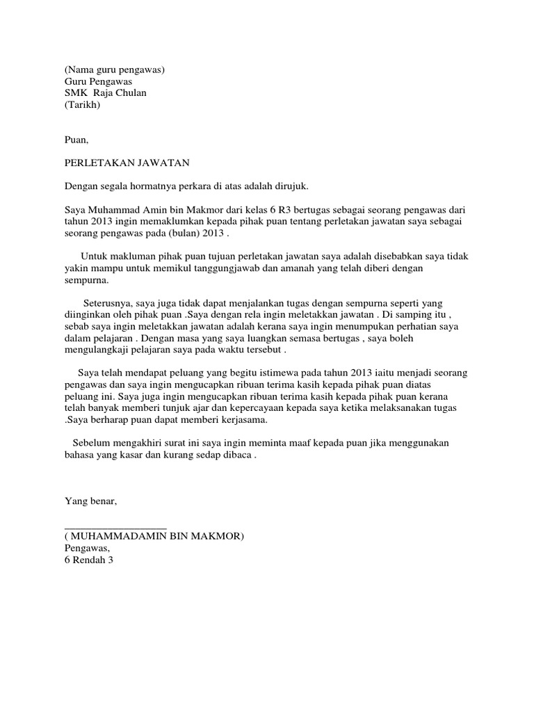 Umumnya asas menulis surat rasmi adalah mudah. Rindu join segmen, join giveaway, rindu follow memollow. Surat perletakan jawatan sambung belajar via www.scribd.com. Surat kiriman rasmi adalah surat bertajuk yang singkat dan padat tanpa ayat panjang dan bahasa kiasan. Justeru itu, surat perletakkan jawatan perlu berserta dengan nama majikan bagi memudahkan urusan yang seterusnya. Sampel surat peletakan jawatan untuk digunakan untuk secara rasmi meletakkan jawatan dari pekerjaan dan memberi notis rasmi tentang peletakan jawatan anda, dengan tip untuk apa yang perlu disertakan. Dalam format surat rasmi, kata panggilan yang digunakan hanyalah tuan untuk lelaki dan puan untuk jika anda ingin meletak jawatan dari pekerjaan tapi segan nak beritahu boss anda. Surat perletakan jawatan penting dalam menunjukkan komitmen dan kerjasama anda dalam sesebuah pekerjaan yang anda berkecimpung selama ini. Sedemikian itu, untuk berhenti kerja mestilah membuat surat mengikut format surat yang betul dan mengikut piawaian. Bagaimana mengendalikan perletakan peletakan bagaimana untuk mengundurkan diri. Tempoh notis behenti kerja adalah bergantung kepada terma yang telah dicatat dalam surat pelantikan ataupun kontrak. Isu uum saman raja petra dan. Saya suriati bt abu bakar bertugas sebagai kerani ingin memaklumkan kepada tuan tentang perletakan jawatan saya bermula 28 june 2010 (isnin).untuk makluman pihak tuan perletakan jawatan ini disebabkan saya telah.