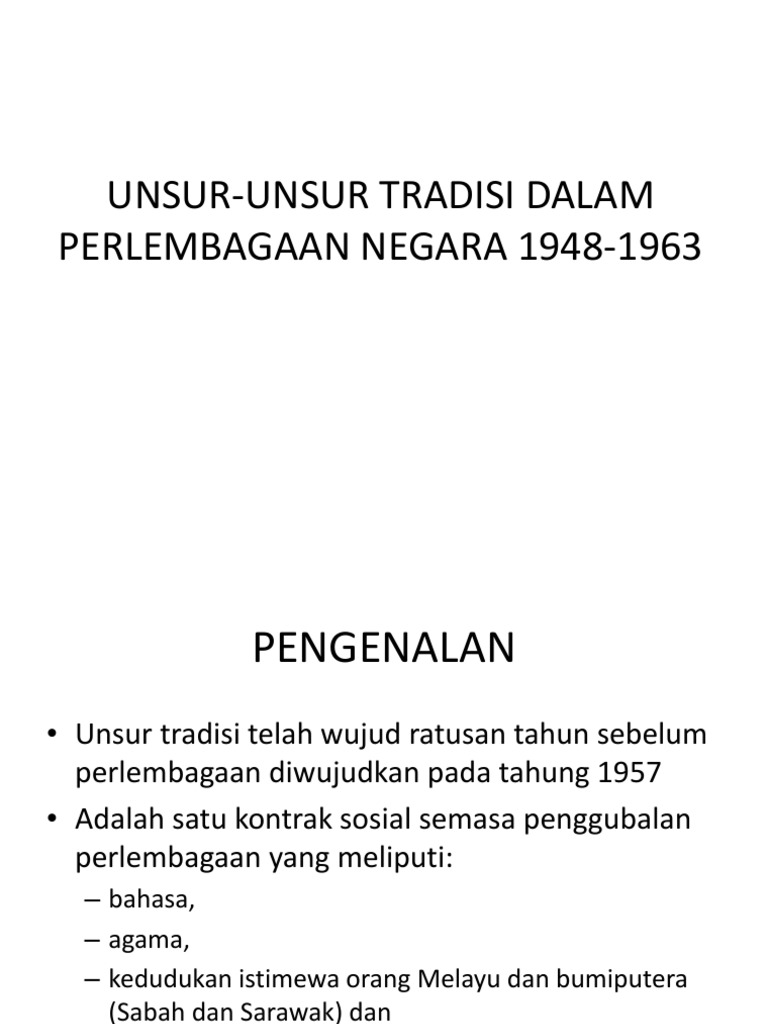 Terangkan 2 unsur tradisi dalam perlembagaan persekutuan. Perkara 3 iaitu agama islam, namun agama lain bebas diamalkan ii. 235773928 peranan unsur unsur tradisi perlembagaan malaysia docx peranan unsur unsur tradisi di dalam perlembagaan kebanyakan perlembagaan persekutuan course hero. Ppt bab 4 perlembagaan persekutuan tiang seri hubungan etnik powerpoint presentation id 5773969. Perlembagaan persekutuan tanah melayu digubal oleh suruhnjaya reid yang ditubuhkan pada 1956.