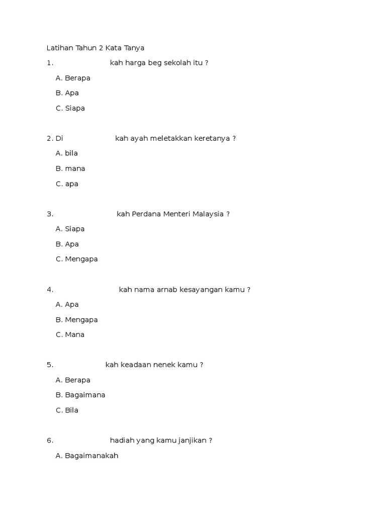 Kah perdana menteri malaysia ? Bm tahun 3 latihan docx bm tahun 3 latihan kata tanya isi tempat kosong dengan kata tanya yang sesuai 14 berapakah mengapakah bilakah apakah course hero. Posted by unknown at 08:50. Latihan tahun 2 kata tanya. Di kah ayah meletakkan keretanya ? Bagus, anda telah melepasi tahap pencapaian minimum ! Leong foong poh december 12, 2012 at 2:12 am. Kata kerja 1 kuiz rancangan mainan. This leaderboard is disabled as your options are. Copy of bahasa melayu tahun 2 lessons tes teach. Bahasa melayu bm grade level. Layari dan langgan modul pembelajaran l. Tahun 2 bahasa melayu ejaan.